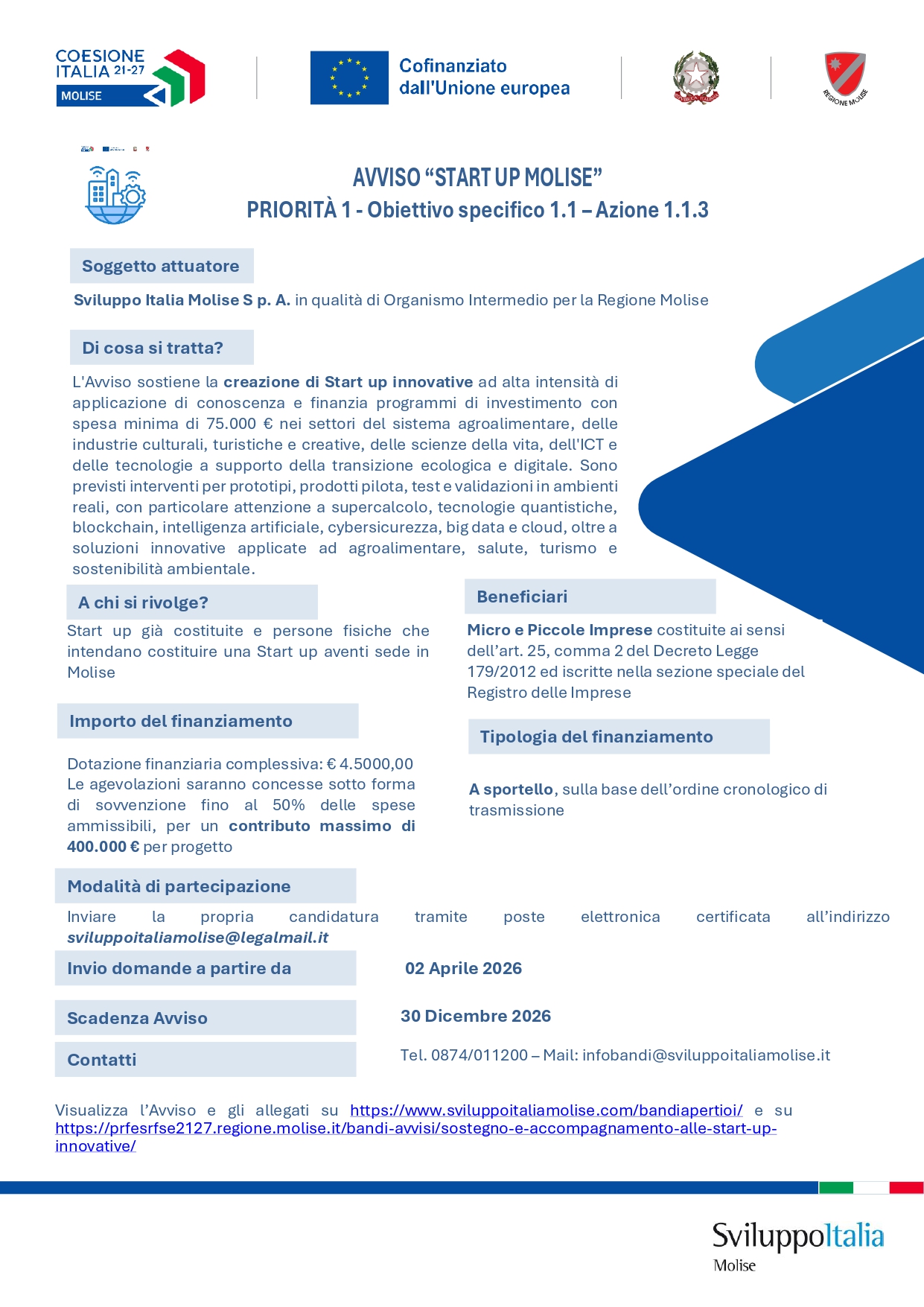 Dal 2 aprile 2026 e fino al 31 dicembre 2026 sarà possibile presentare la propria candidatura in risposta all’Avviso per il sostegno e l’accompagnamento alle Start up innovative ad alta intensità di applicazione di conoscenza (Priorità 1 Azione 1.1.3 – PR MOLISE FESR-FSE+2021/2027).